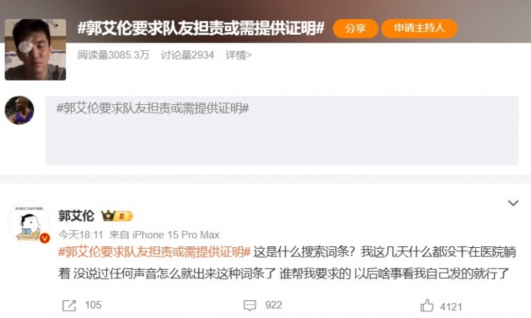 郭艾倫配文:“這是什么搜索詞條?我這幾天什么都沒干在醫(yī)院躺著,沒說過任何聲音怎么就出來這種詞條了,誰幫我要求的,以后啥事看我自己發(fā)的就行了。”