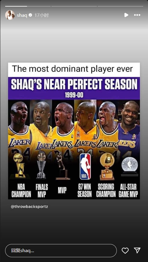 歷史最具統(tǒng)治力單賽季表現(xiàn)?99-00賽季的奧尼爾 一人囊括5項(xiàng)大獎(jiǎng) 籃球新聞 2025年02月28日 10:54 02月28日訊 今日,奧尼爾更新社媒曬出了歷史最具統(tǒng)治力的單賽季表現(xiàn)。1999-2000賽季的奧尼爾自己,他一人囊括5項(xiàng)大獎(jiǎng)(總冠軍、總決賽MVP、常規(guī)賽MVP、得分王、全明星MVP)+單賽季67勝。 上一條:韓旭談瓊斯加盟:如果有三高陣容 希望我有機(jī)會(huì)能圓一次外線夢(mèng) 下一條:基德:濃眉恢復(fù)得很好 我們很快就會(huì)知道事情的進(jìn)展