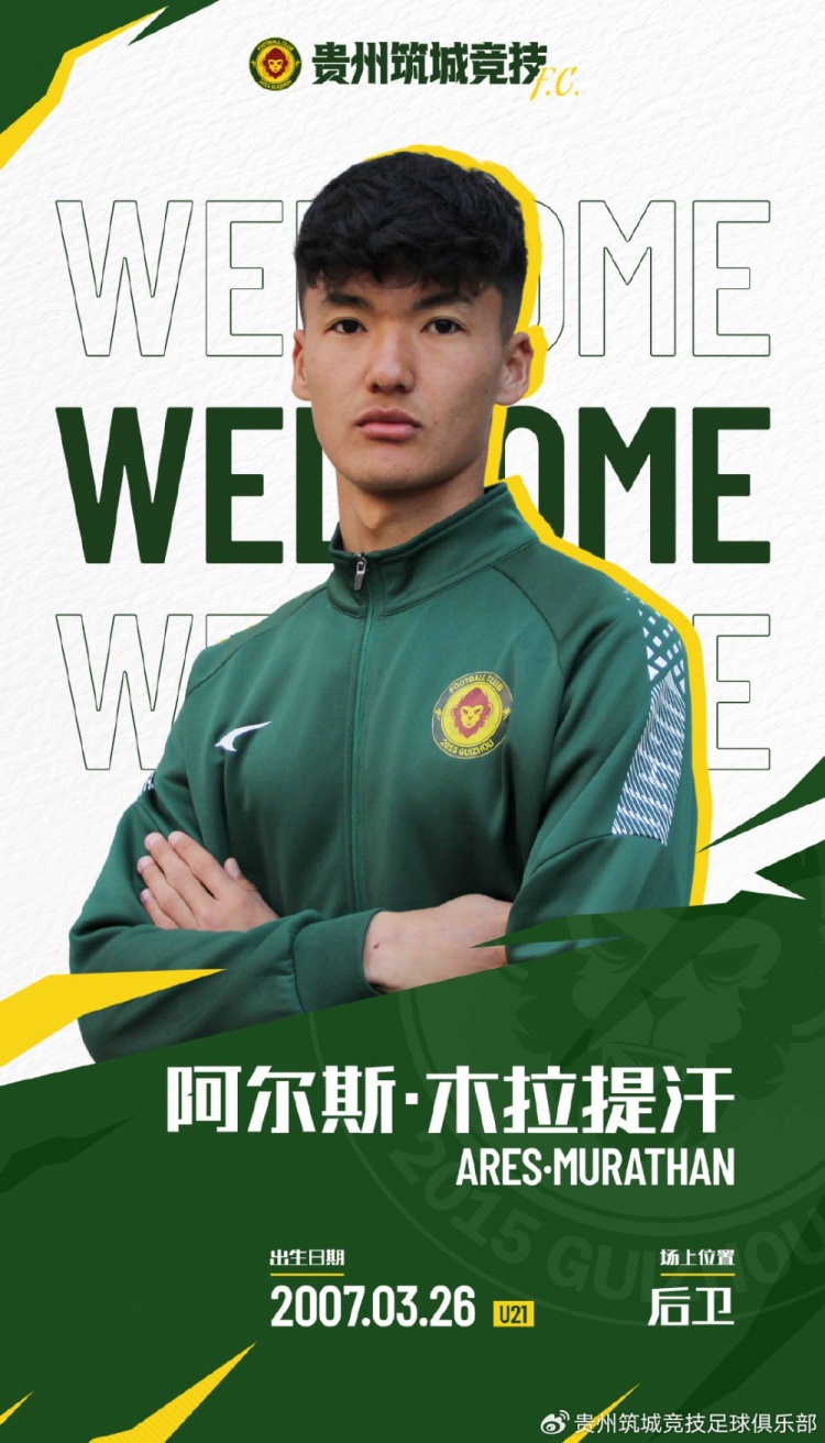 3月1日訊 中乙貴州筑城競技官方消息,侯宇陽、阿爾斯-木拉提汗加盟球隊。