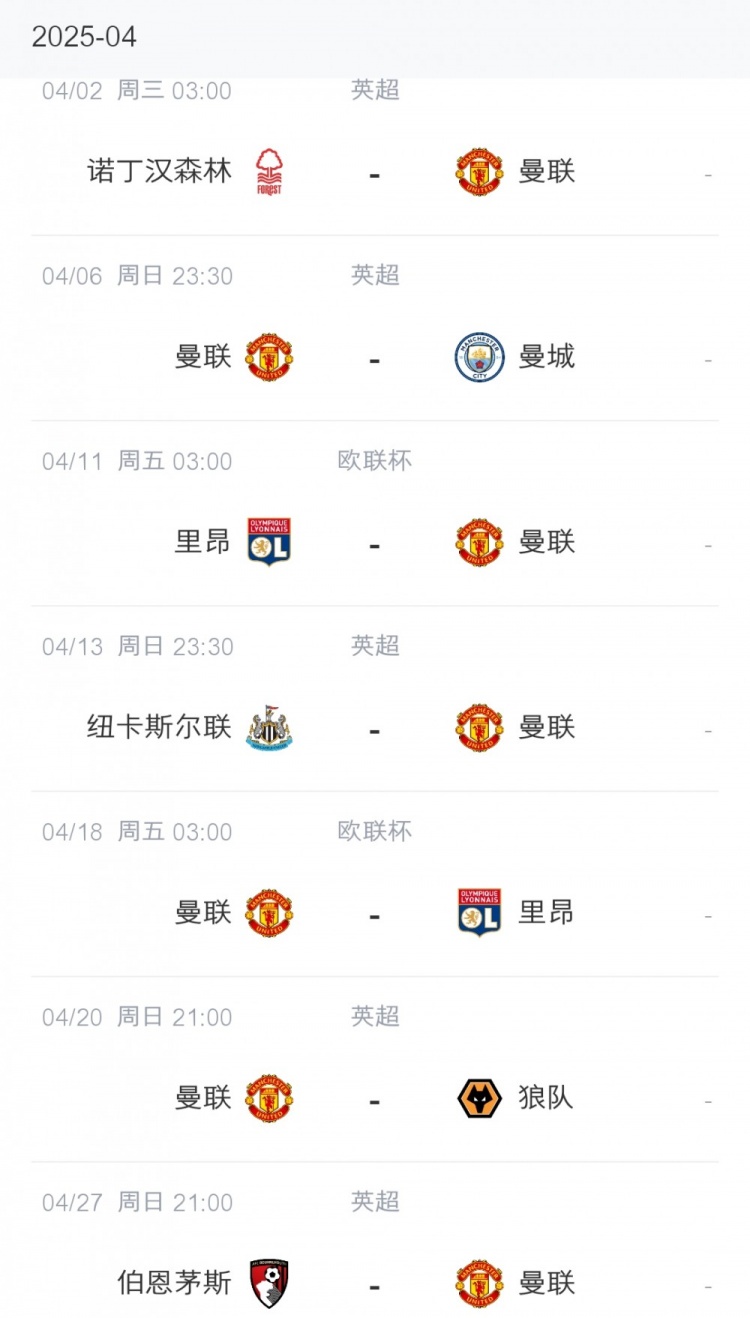 曼聯(lián)4月賽程: