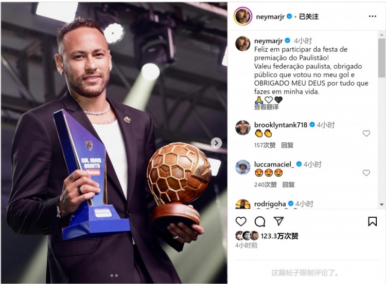 角球直接破門!內(nèi)馬爾社媒曬最佳進(jìn)球獎(jiǎng)杯:感謝投票支持我的球迷