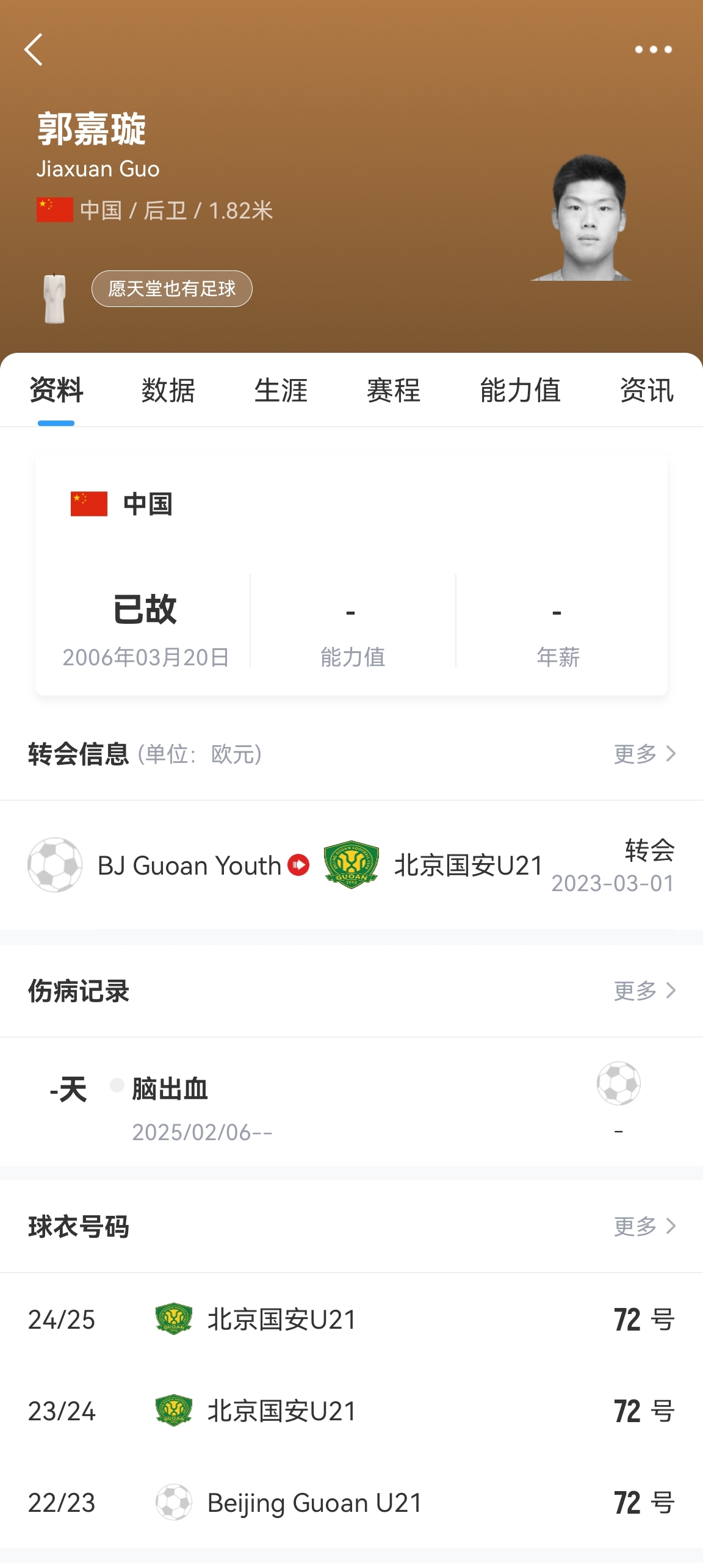 3月19日,國安小將郭嘉璇在天壇醫(yī)院去世,年僅18歲,當(dāng)時(shí)距離他19歲的生日只有1個(gè)小時(shí)。