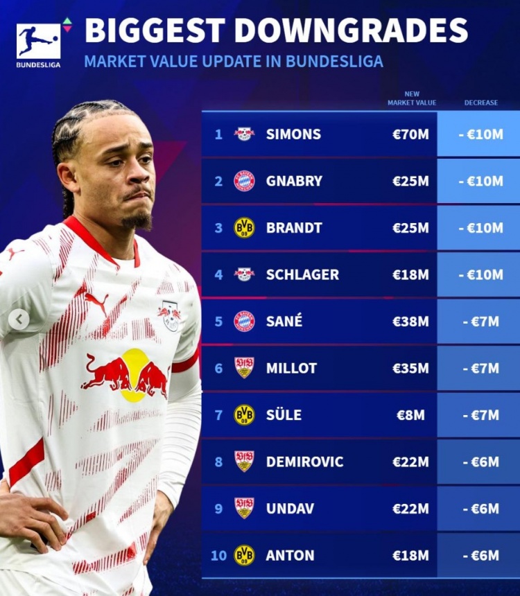 德轉(zhuǎn)列身價(jià)更新后德甲升值榜:歐元