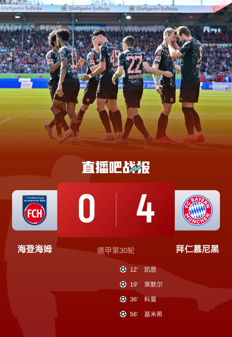 德甲第30輪,拜仁客場(chǎng)4-0大勝海登海姆,凱恩、萊默爾、科曼、基米希進(jìn)球。