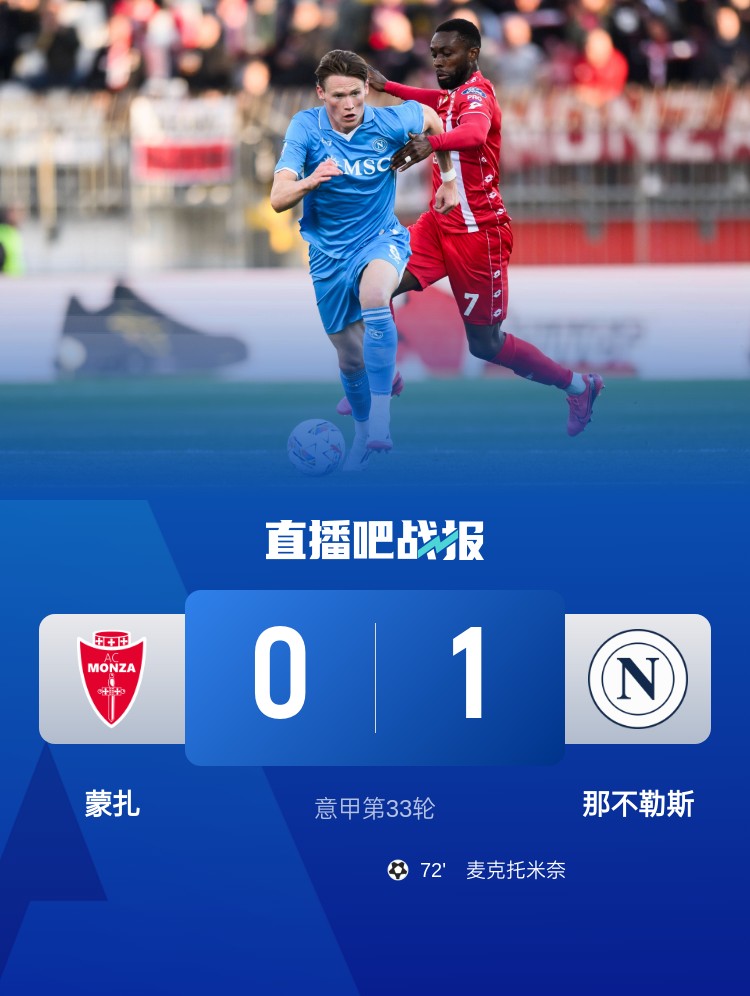 意甲第33輪,那不勒斯客場(chǎng)1-0蒙扎,麥克托米奈制勝。