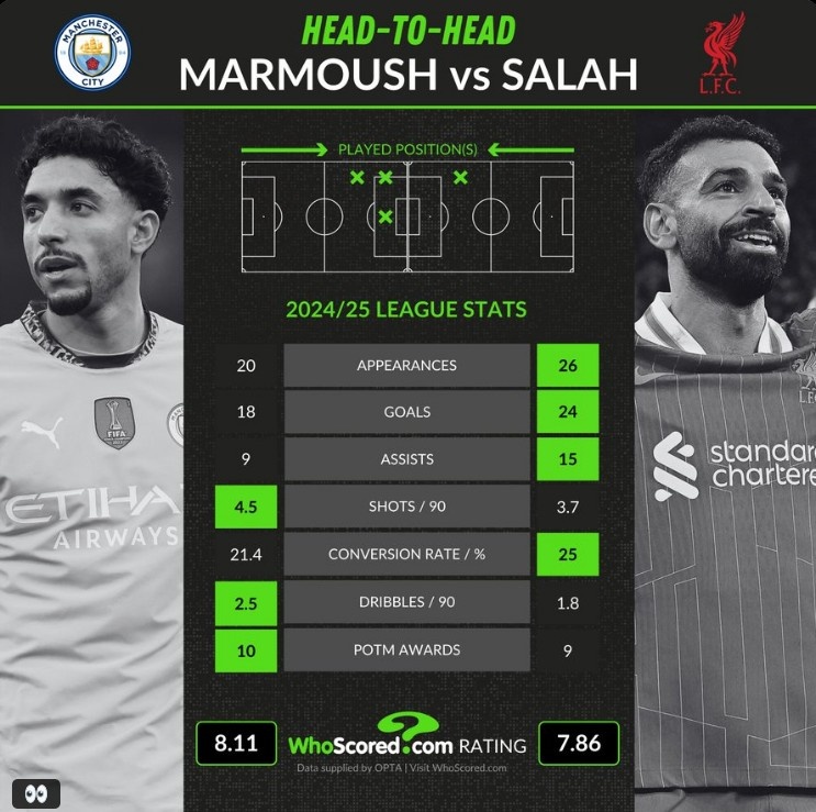 2月23日訊 本輪英超將迎來曼城與利物浦的焦點對話,也是兩位埃及前鋒薩拉赫、馬爾穆什首次在英超交鋒,數(shù)據(jù)網(wǎng)站W(wǎng)hoscored對比了本賽季兩人在聯(lián)賽中的數(shù)據(jù),具體如下: